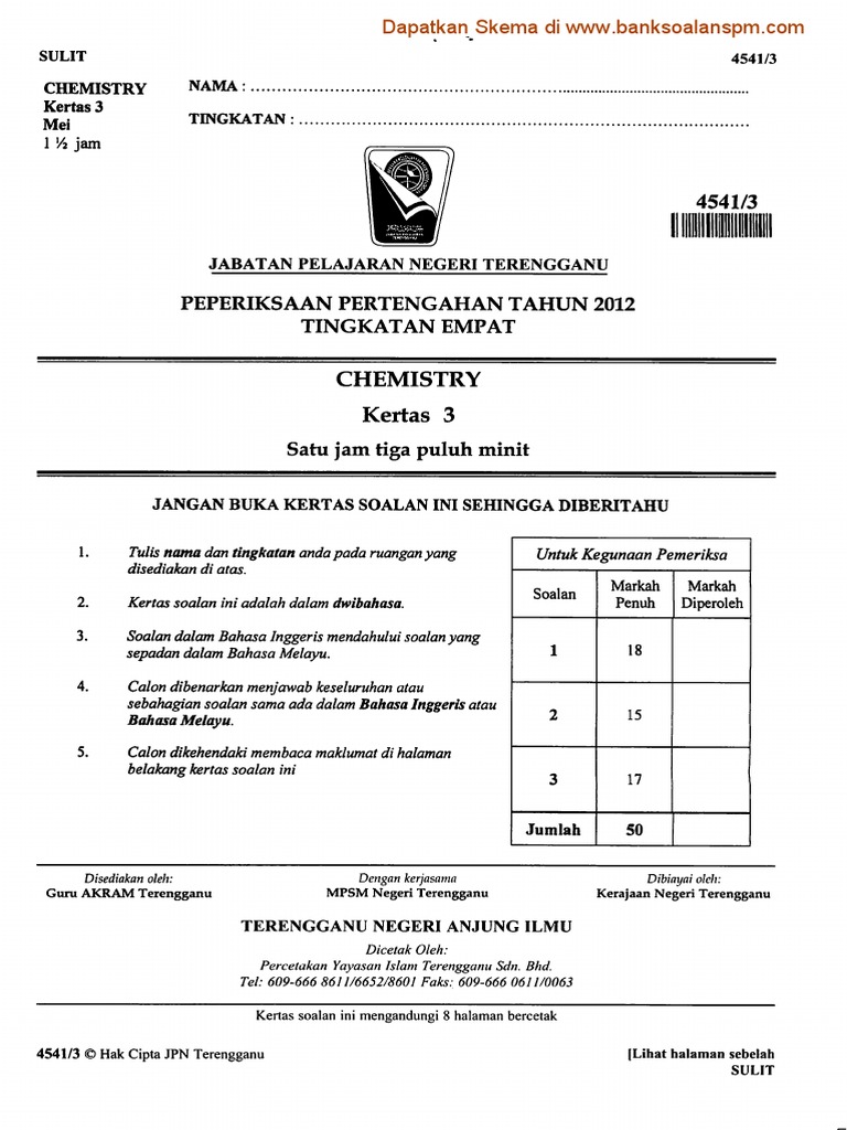 Kimia Kertas 3 Ting 4 Pertengahan Tahun 2012 Terengganu