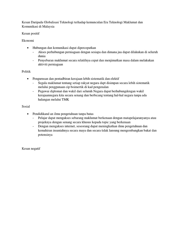 Kesan Daripada Globalisasi Teknologi Terhadap Kemunculan Era Teknologi Maklumat Dan Komunikasi Di Malaysia